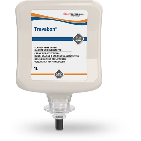 Travabon® Classic to specjalistyczny krem ochronny, który zabezpiecza skórę przed działaniem substancji ropopochodnych i przylegających. Unikalnie opracowana formuła chroni skórę przed działaniem substancji roboczych na bazie oleju i ułatwia skuteczne oczyszczanie skóry. Dzięki wysokiej zawartości składników mineralnych, tworzy na skórze mocną, wysoce odporną fizyczną warstwę ochronną, która zapobiega wnikaniu substancji w głąb skóry. Mieszanka środków powierzchniowo czynnych wchodzących w skład warstwy ochronnej aktywuje się po wstępnym spłukaniu rąk czystą wodą, umożliwiając usunięcie większości zabrudzeń. Krem nie zawiera sylikonów.Kompatybilny z większością systemów dozujących.