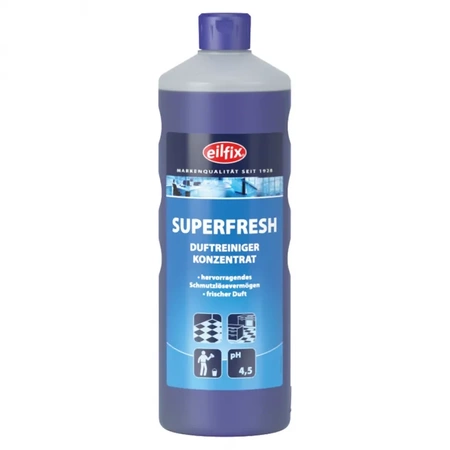 - Koncentrat zapachowy SUPERFRESH 1 l to wysokiej jakości produkt, który służy do codziennego czyszczenia konserwacyjnego różnych materiałów wodoodpornych. Jest lekko kwaśny i zapewnia przyjemny zapach podczas czyszczenia.