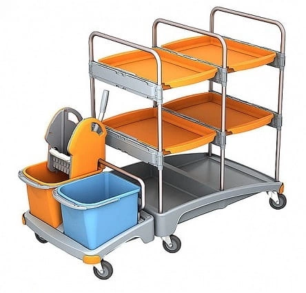 - Praktyczniewyposażony zestaw do sprzątania - wózek serwisowy z tworzywa sztucznego. Doskonale sprawdzi się w dużych obiektach jak np. hotele jako zestaw usprawniający prace personelu sprzątającego. Dwa duże wiadra 20l i prasa do wyciskania mopa oraz 4półk