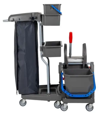 - Wózek dwu wiaderkowy o całkowitej pojemności wiader 2 x 18 litrówz wyciskarką szczękową, stelaż z bardzo wytrzymałego tworzywa(kopolimer polipropylenowy).