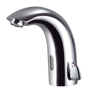 Bateria umywalkowa, bezdotykowa z mieszaczem stanowi wyposażenie łazienek użytku publicznego. Bateria została wykonana ztrwałego mosiądzu. Posiada chromowane wykończenie. Działanie Na fotokmórkę Opcja Na wodę ciepłą izimną Mieszacz